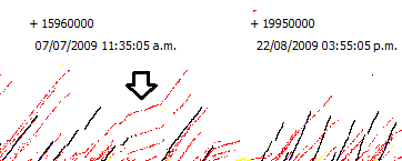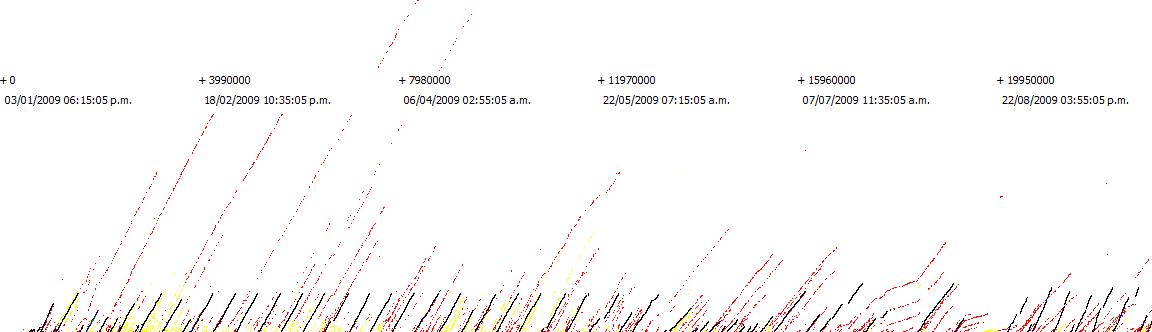 Now it’s clear that all computers up to 07/07/2009 that hash steadily for more than 10 days are hashing approximately at the same speed, including Satoshi’s (look at the red long lines in the previous graph vs the black lines). But also this raises another question: Why should they? There should be more disparity over the performance of computers if they were casual users trying Bitcoin. The answer may be one of the following: