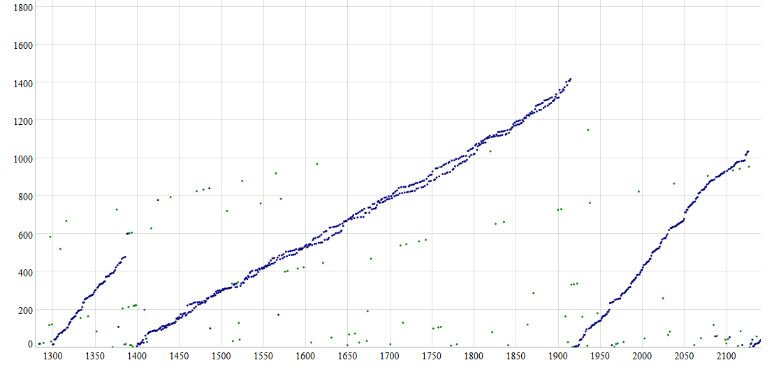 In another attempt to discover more about Satoshi hardware, I scanned all pair of Satoshi blocks where the extraNonce of the second block is one unit higher that the extraNonce of the first block. Since the extraNonce is incremented each time a new block is prepared to be solved, the minimum possible extraNonce difference is 1. Then I filtered the pairs where they were as close as possible temporally using the nTime field, e.g. 250 seconds apart. Since the nonce rolled about 5 times in 10 minutes because of the Satoshi LSB restriction, then one can expect than it should not roll if the time difference is less than 2 minutes. My intention was to count the number of times the nonce value of the second block was higher than the nonce value of the first block, and the number of times it was lower. But there were no enough pairs with time difference under 2 minutes as I would have expected. This is odd. One explanation is that the Satoshi miner, after a block was solved, waited some time until the remaining “threads” that were still processing the previous block finished computing, without automatically killing these threads, or flagging them to stop. This would also imply that the Satoshi miner was not very optimized.