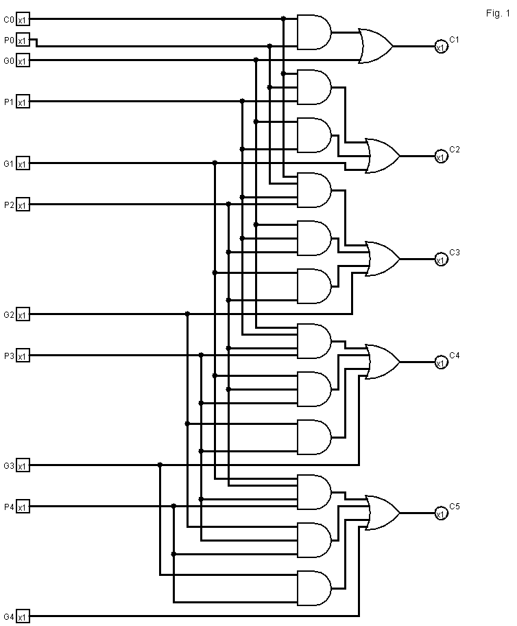 Extensions of the CR-CLA design to hierarchical designs can be naturally created in a similar way of hierarchical CLAs. The CR-CLG block of the CR-CLA adder can be placed at one level and another CR-CLG at higher level. Also a standard CLG can be placed at one level and CR-CLG at higher levels. A (k,n)-CR-CLA adder is a n-bit CLA where the carry at bit c(i) is computed using the propagation (P(j)) and generation (G(j)) signals of the at most k contiguous bits of lower significance adjacent to the bit i, where 0<k<n. The case k=n would be a standard n-bit CLA. The reduction in the number of inputs used to compute each carry (the carry generation logic) allows the saving of logic gates and the reduction of the delay. Figure 1 shows a (4,5) CR-CLA with input carry. Each carry takes into account no more than 4 previous carries.