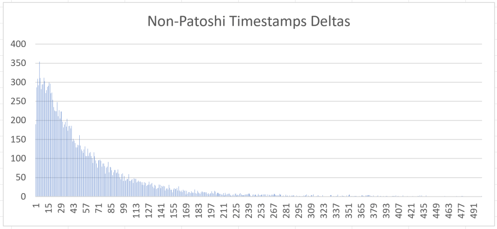 Now it looks much cleaner! The remaining complementary graphs, being timestamps deltas between Patoshi blocks and non-Patoshi blocks and vice-versa, look quite normal, so I’ll omit them.