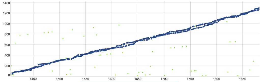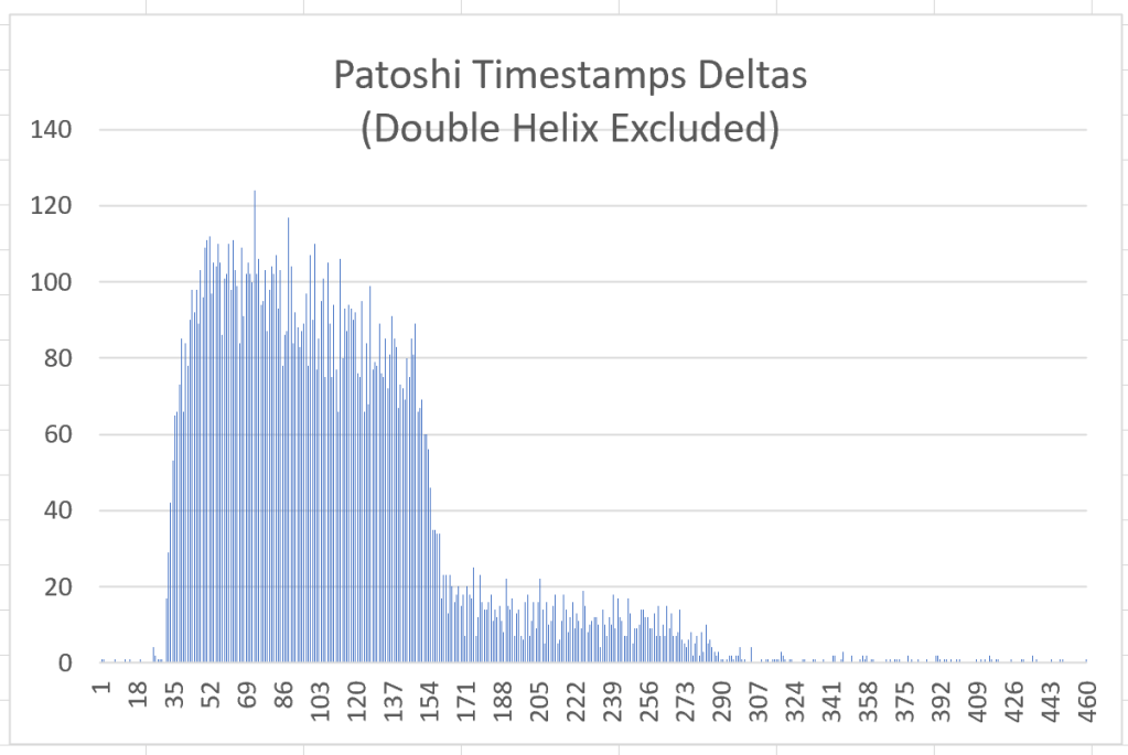 If you look carefully at the timestamp delta distribution, there are a high number of timestamp deltas before 312 seconds that make for me even more difficult to explain the steep cliff shape. Luckily this one puzzle we can unravel with some information we already know. The reason of this “noise” is a segment in the Patoshi pattern that I named “Double Helix”, because it looks graphically as DNA. Here is a graph of this segment:
