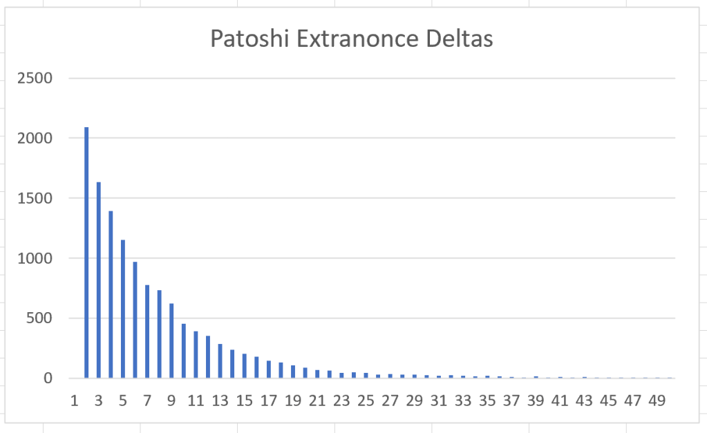 One may think that Patoshi may have decided to discard blocks when they were mined too close, not to overload the early and frail network, since very few transactions were included in early blocks. However, if we look at the distribution of extranonces between consecutive Patoshi blocks, we can see the curve is still exponential, meaning that no blocks were discarded: